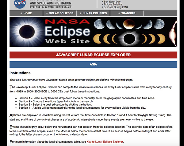 想知道你所在的地点是否能够欣赏到这次天文奇观,可以在NASA的Lunar Eclipse Explorer输入自己的位置,来获得所有细节。
