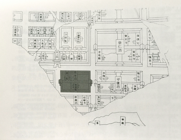 另根据元祐五年(1090年)《京兆府府学新移石经记》碑中所记“地杂民居,其处洼下,霖潦中注,随立辄仆,埋没腐壤,岁久折缺,殆非所以尊经而重道” 可知,元祐二年(1087年)时任陕西转运副使的吕大忠,因石经所在唐“尚书省之西隅”地势低洼、水漫碑扑等原因,将唐石经“徙置于府学之北墉”。这里“府城之坤维”与“府学之北墉”所指为同一地,因“庙学合一”制度的影响,历来府学与文庙都是相随搬迁,故此次唐石经的迁移地仍为文庙。此碑还记录了唐石经迁至新址后,《开成石经》与《石台孝经》的位置关系。《开成石经》“分东西次比而陈列焉,明皇注孝经及建学碑则立之于中央,颜、褚、欧阳、徐、柳之书,下迨偏旁字源之类,则分布于庭之左右”。即《开成石经》是分东西两边依次陈列,“明皇注孝经”即《石台孝经》和“建学碑”立于两列《开成石经》的中间。