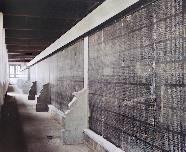 儒家经典唐《开成石经》刻制于唐文宗开成二年(837),共114石,228面,共计160卷,65万余字。内容包括《周易》《尚书》《毛诗》《周礼》《仪礼》《礼记》《春秋左氏传》《公羊传》《毂梁传》以及《孝经》《论语》《尔雅》等十二种经书,加上所附《五经文字》和《九经字样》。据《旧唐书·郑覃传》载,太和四年(830年)四月,时任工部侍郎兼充翰林侍讲学士的郑覃,向文宗进言:“经籍讹谬,博士相沿,难为改正。请召宿儒奥学,校定六籍,准后汉故事,勒石于太学,永代作则,以正其阙。”此记载说明石经刻成就立于太学。另据《唐会要》载:太和七年(833年)“十二月,敕于国子监讲论堂两廊创立石壁九经,并孝经、论语、尔雅共一百五十九卷,字样四十卷”。《开成石经》刻成之后立于国子监讲论堂两廊。这里的“讲论堂”就位于国子监中文庙之西。