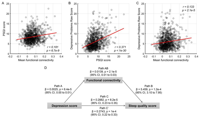 图A、B、C展示了抑郁问题,睡眠问题以及脑功能连接三者之间的相关性,图D展示了脑功能连接调制抑郁问题与睡眠问题的关系