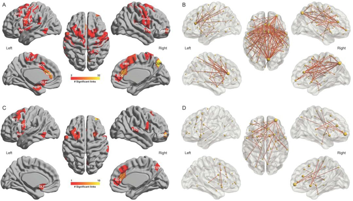 睡眠以及抑郁问题相关联脑区(AC)以及脑功能连接(BD)在脑中的分布情况