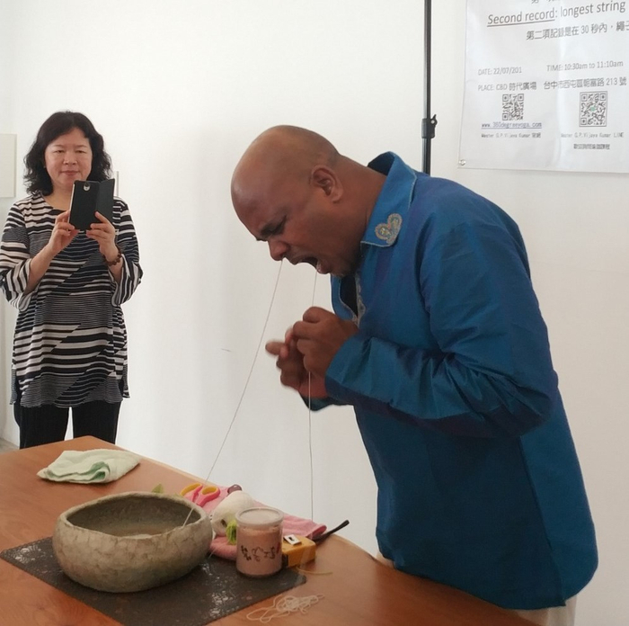 据台湾“联合报”7月22日报道,来自印度的卫杰自幼学习瑜伽,他今天(22日)挑战2项吉尼斯世界纪录,将棉绳自鼻进口出以及口进鼻出,记录通过的绳长,主办单位全程录像,将送吉尼斯世界纪录管理团队审核。