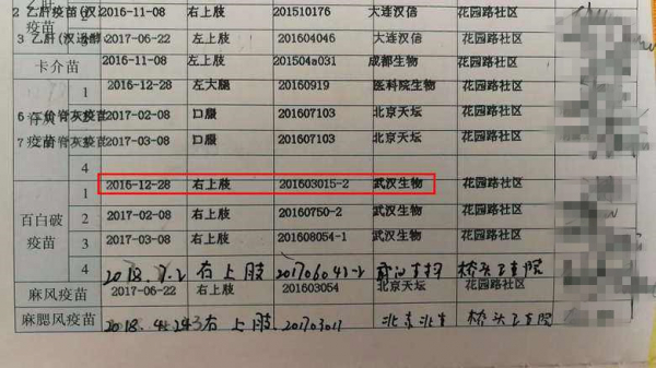 (图:找到接种本上的疫苗批号(示例:红框中的201603015-2),在手机淘宝、支付宝、UC、阿里健康App进行查询。)