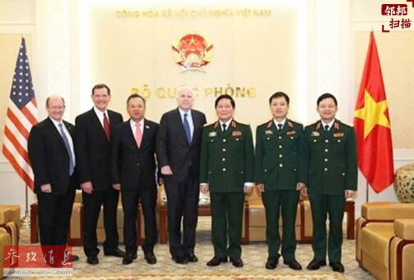 据越南人民军队报网站6月1日报道,5月31日下午,越防长吴春历在河内接见越战老兵、美国参议院约翰·麦凯恩率领的美参议院军事委员会代表团。吴春历强调约翰·麦凯恩对促进美越关系正常化所作的重要贡献,约翰·麦凯则强调,此次访越之后将建议美国国会和政府继续协助越南落实橙色毒剂污染清除项目,克服战争遗留后果。不过有媒体称,麦凯恩此访是想促成美舰停靠金兰湾常态化,6月2日他还专程看望在金兰湾停靠休整、以他祖父和父亲(2位美军上将)命名的“麦凯恩”号导弹驱逐舰(DDG-56)官兵,还为舰上水手主持入伍宣誓仪式。