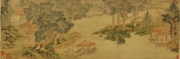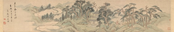 《木泾幽居图》,绢本,青绿设色,纵25厘米,横74厘米,画面描绘的是明代文学家——号称“昆山三隽”之一周子籲的别苑。周子籲即周复俊(1496—1574),号木泾子,江苏昆山人。嘉靖壬辰(1532)进士,曾任云南左右布政使、南京太仆寺卿等官职。在文学史上负有盛名,著有《东吴名贤记》《全蜀艺文志》《玉峰诗纂》等。《木泾幽居图》作于明嘉靖十六年(1537),时年文徵明68岁。这年,周子籲出使滇南,返回时拜访了乡中前辈文徵明,文徵明便作《木泾幽居图》并题诗相赠。