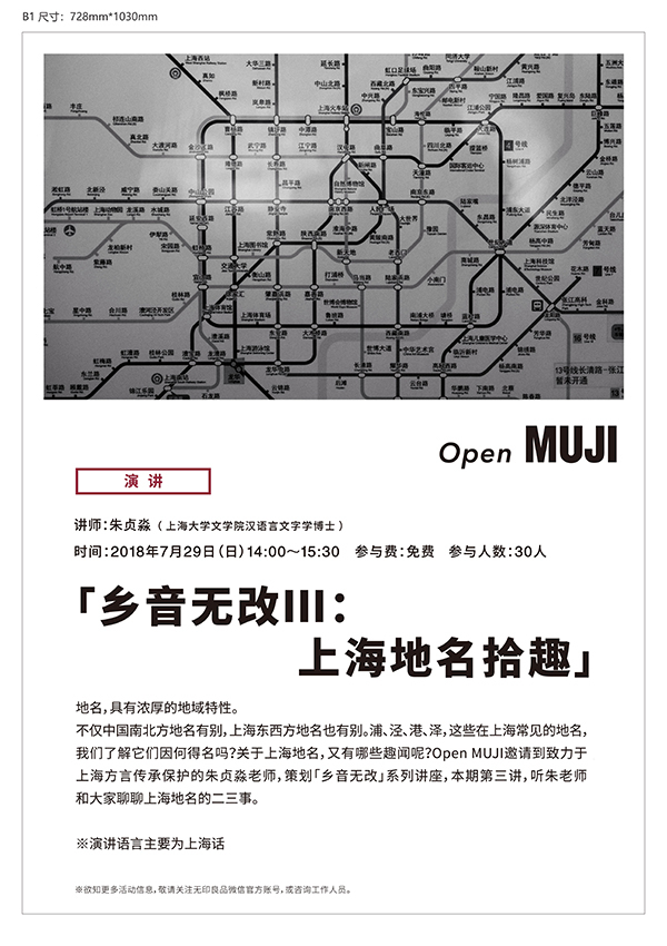 地名,具有浓厚的地域特性。不仅中国南北方地名有别,上海东西方地名也有别。浦、泾、港、泽,这些在上海常见的地名,我们了解它们因何得名吗?关于上海地名,又有哪些趣闻呢?Open MUJI邀请到致力于上海方言传承保护的朱贞淼老师,策划“乡音无改”系列讲座,本期第三讲,听朱老师和大家聊聊上海地名的二三事。
