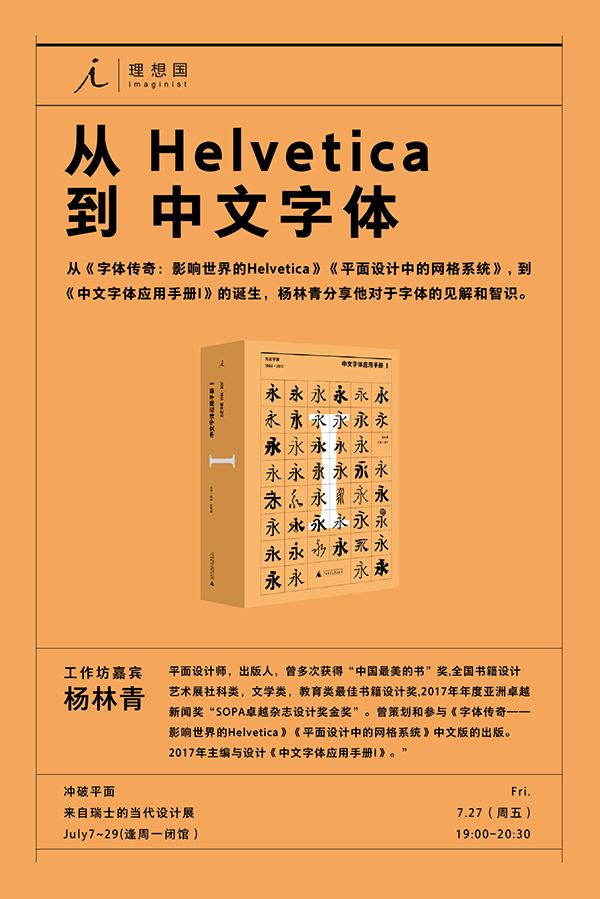 对于字体的热情和兴趣在近几年火热发展,理想国最新推出国内知名设计师杨林青主编的《中文字体应用手册I》。这本书是新中国成立后首部中文字体应用工具书,代表了国内字体应用研究的一个阶段性成果。本次活动我们特别邀请到杨林青,来分享他对于字体的见解和智识,以及他亲身经历《字体传奇:影响世界的Helvetica》、《平面设计中的网格系统》、《中文字体应用手册I》这三本书诞生的故事。