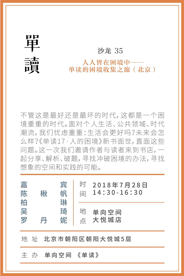 不管这是最好还是最坏的时代,这都是一个困境重重的时代。我们在成长历程、个人生活中曾经或者正在面对的痛苦,我们在公共视野和社会生活中所见证甚至参与的不公,我们对时代潮流和世界走势的忧虑……生活会更好吗?未来会怎么样?新一辑《单读》继续思想训练,选择直面它们。这一次单读邀请我们的作者与读者来到书店,一起分享、解析、破题,寻找冲破困境的办法,寻找想象的空间和实践的可能。