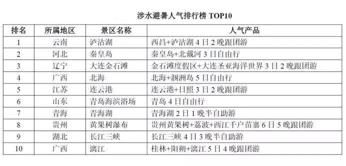 “上山”、“下海”、“入草原”是避暑旅游产品的主要承载体,报告根据网上浏览搜索与预订出行人数,发布了山地、海滨、草原十大受欢迎避暑景区和热门产品。四川泸沽湖、河北秦皇岛、大连金石滩国家旅游度假区等入选涉水避暑排行榜。