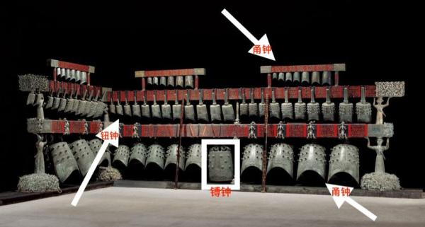 另外,编钟分为三层悬挂,上面是钮钟,中层是甬钟,下层也是甬钟。三层的钟大小不一样,因而编钟发出的声音是有区别的。所以应该来讲,曾侯乙编钟能够很好地体现战国时期高超的青铜铸造技术。
