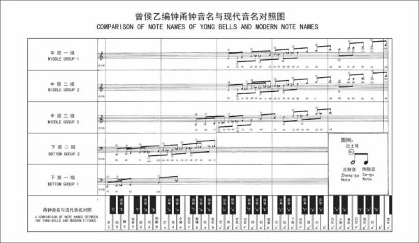 曾侯乙编钟不仅具有“一钟双音”这一了不起的成就,还有就是七音齐备,并且具有12个半音。我们如何去理解呢?可以对比钢琴,在一个八度里,7个白键和5个黑键构成12个音,即12平均律,曾侯乙墓的12个半音跟12平均律是一个概念。钢琴有七个八度,曾侯乙编钟有五个半八度,音律很宽广。