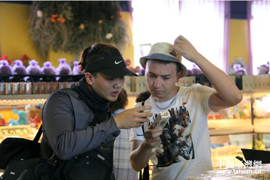新疆本土知名网络剧《石榴熟了》主演、自媒体编导热法提?艾尼瓦(右)向90后台湾自媒体人汪俊言(左)介绍新疆伊犁的薰衣草产品。(中国台湾网 王怡然 摄)