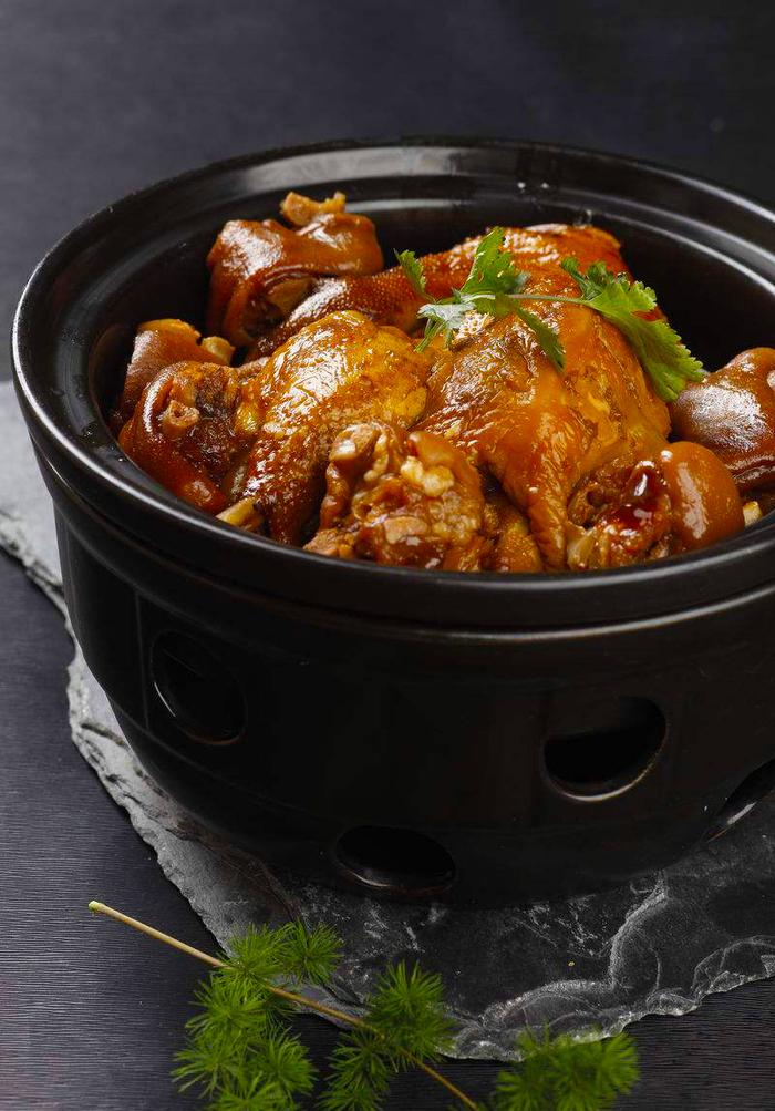 该菜系选用肥嫩仔鸡为原料,经宰杀治净后,以整鸡置砂钵。用麻油浇淋全鸡,再用上十种调料腌渍,再加高汤及香料、冰糖等调料烧沸,然后移小火至汁浓鸡熟装盘。色泽酱红,香糯软嫩,很有特色。