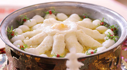 此菜是根据西陵峡口雄伟壮观的景色构思制成的美味佳肴,除了色香味俱全,峡口明珠汤还颇有“诗意”:清蒸鸡蛋制成西陵峡口群山峰状,浮于鸡汤汤面,三色鱼丸似明珠漂浮于群山之间,形象逼真,仿佛置身于三峡美景之中。观看引人入胜,品味更是鲜嫩爽口。