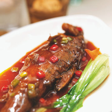 此菜采用虎牙滩到南津关一带出产的肥鱼,和肥膘肉共蒸而成。鱼肉鲜嫩,鱼汤肥美,菜肴清淡,原汁原味,深受中外食者好评。在此基础上,还制作有绣球肥鱼,牡丹珍珠肥鱼等花色。