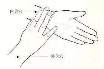 内关穴位于掌心面前臂正中,腕横纹直上两寸(这里的寸是指“同身寸”,以每个人自身大拇指的宽度为“1寸”),大约从腕横纹往手腕方向三横指处的中间点;而外关穴位于掌背面,位置刚好跟内关穴相对应(如图所示)。