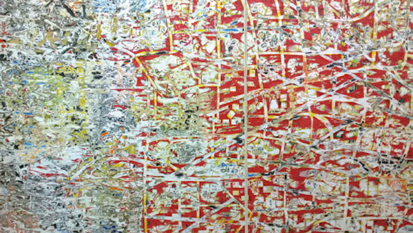 马克•布拉特福德(Mark Bradford)的创作,消除着“风景”“地图”和“绘画”之间的界限。他的作品层次丰富,他将报纸、杂志、海报、广告传单层层叠叠地拼贴在画布上,然后在上面不断地进行刮擦、撕扯、重叠,让画面呈现出一种格外丰富的肌理。他关注着社会阶层、性别、区域政治等话题,他的创作也常常与当地的地图有关。在香港,他以公屋的建筑平面图作为创作起点,从城市规划角度,从闹市中捡拾创作用的物料,在画面上层层叠叠的,是香港的密度和历史的深度,这个世界上人口最稠密的都市里,唯有俯瞰全景,才能感受到权力和政治是如何影响了这座城市。在上海,他关注的是上海城市景观百年来的布局。