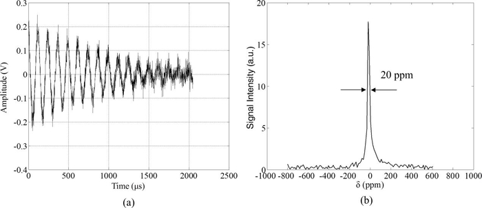 图4. (a) 数字解调后的FID信号波形;(b) 水样本的波谱频率图
