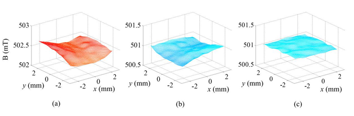 图2. (a) z = 0平面5 mm 长度正方体磁场分布,场均匀度为 576 ppm;(b) 使用磁块匀场后磁场分布图,均匀度达到 350 ppm;(c) 增加钨钢片匀场后磁场分布图,均匀度达到120 ppm