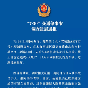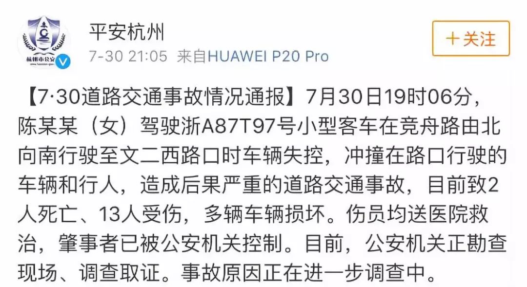 杭州“7·30”交通肇事案已致4死13伤:对犯罪嫌疑人陈某某采取刑事强制措施