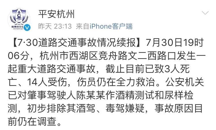 当晚23:13,杭州警方官方微博@平安杭州 通报,事故已致3死14伤。公安机关已对肇事驾驶人陈某某作酒精测试和尿样检测,初步排除其酒驾、毒驾嫌疑,事故原因目前仍在调查。