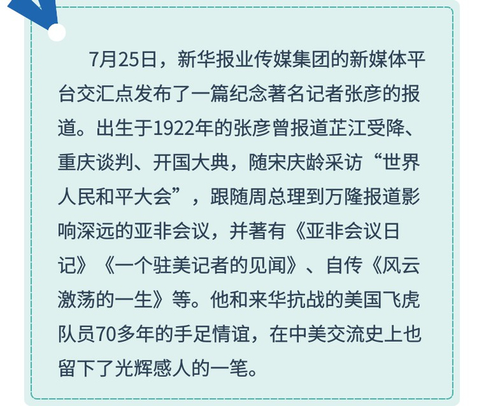 今年7月14日,张老因病抢救无效在北京逝世,享年97岁。张老逝世后,交汇点根据南京大学外语部副教授赵庆庆及张老家人提供的影像和文稿资料,以新闻报道的形式回溯了张老的传奇一生,并通过他的经历重温共和国筚路蓝缕、继往开来的峥嵘历程。
