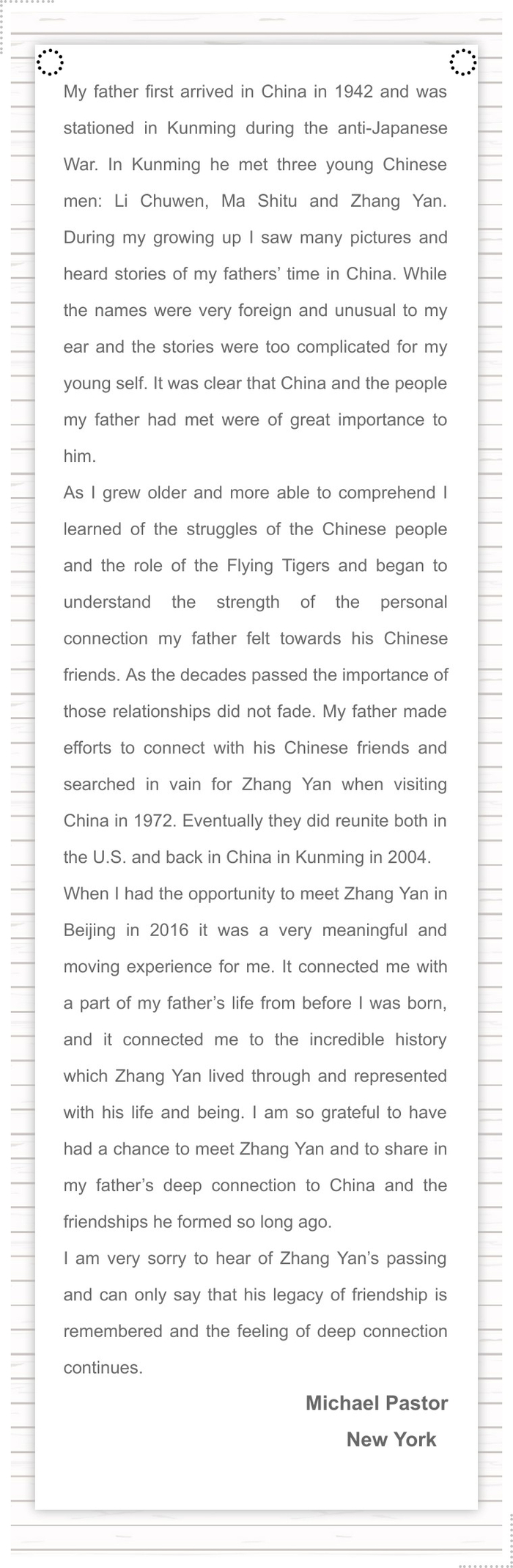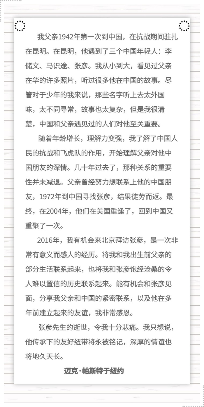 斯人已逝,跨越中美两国的飞鸽传书不绝。读到这篇报道之后,张彦先生的生前至交、飞虎队老兵迪克·帕斯特之子迈克·帕斯特特意写下一篇文章,既是感念交汇点对此事的报道,也是表达对父亲挚友的敬爱和追思。下面是迈克·帕斯特写下的追思原文和赵庆庆老师的译文。