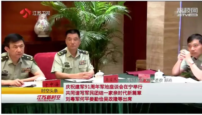 其实,于中海以新职务首次公开出现应当更早一些。在7月31日晚江苏卫视“江苏新时空”播出的新闻中,于中海出席了7月30日在南京举行的庆祝建军91周年军地座谈会。在电视画面上,于中海的左手边是江苏省武警总队司令员吴启庆。在长桌另一侧和于中海对位就坐的,是江苏省军区政委孟中康,孟中康右手边是江苏省武警总队政委曹红波。