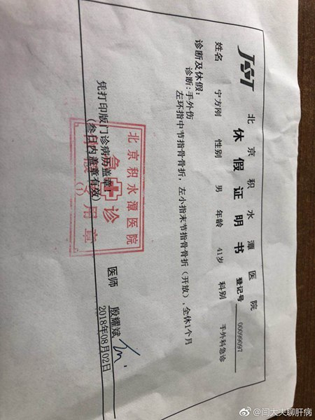 随后,一位认识宁方刚的网友发出一份带有“北京积水潭医院急诊”印章的休假证明书,该证明书显示,宁方刚于8月2日被诊断为手外伤,左环指中节指骨骨折,左小指末节指骨骨折(开放),全休一个月。
