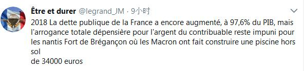 网友指责道,“法国公共债务不断攀升,占了GDP的97.6%,但他依然花着纳税人的3万4千欧元建游泳池,享受特权而不被惩罚”。
