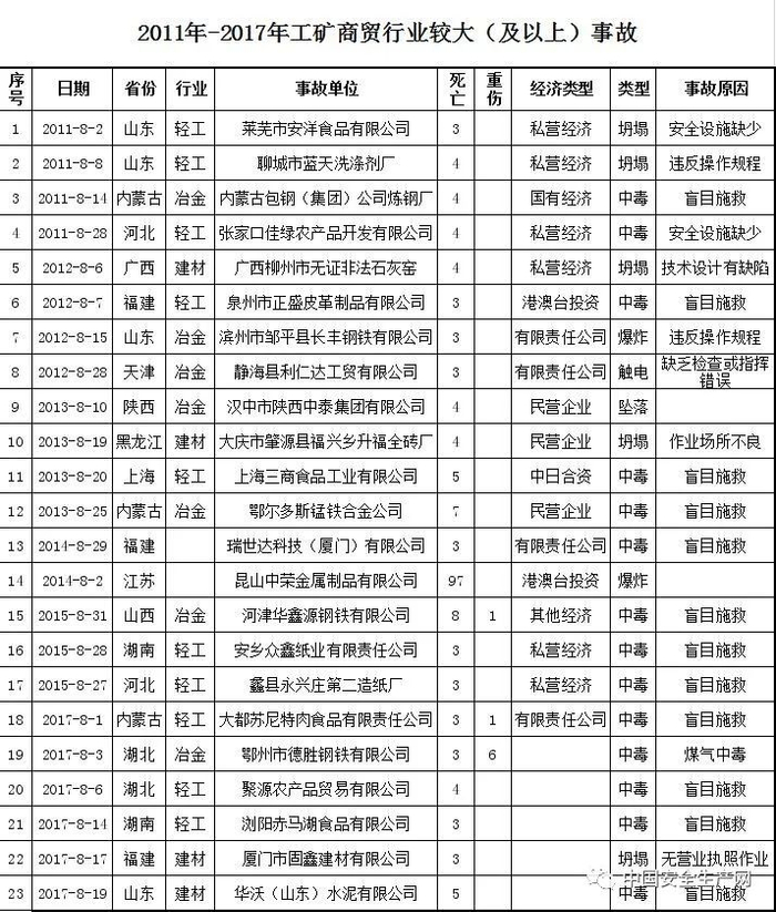 5年以来,工矿商贸行业发生较大及以上事故23起,中毒和坍塌事故最多,其中中毒事故14起,占一半以上,而中毒事故又多数因 为盲目施救而导致故事扩大。