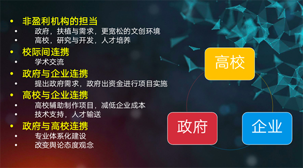 熊硕:中国游戏要走出去,需要政府、高校、企业三方合作,依靠还没有被资本完全遥控、保持初心的中小企业以及热爱游戏为此奋斗的独立游戏团队;依靠高校的人才培养和体系化建设;也依靠政府的政策支持。