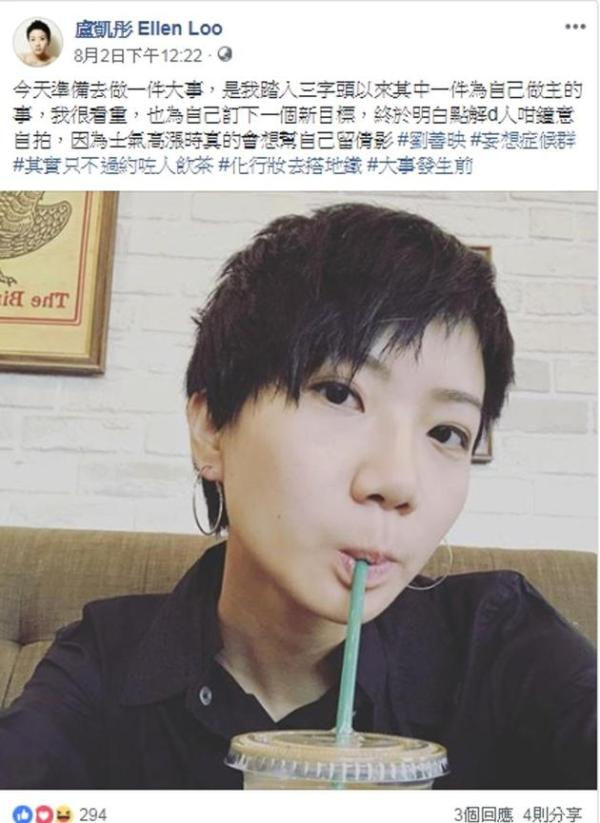 卢凯彤8月2日在脸书贴出自拍,并留言:“今天准备去做一件大事,是我踏入三字头以来其中一件为自己做主的事,我很看重,也为自己订下一个新目标,终于明白为什么人们喜欢自拍,因为士气高涨时真的会想帮自己留倩影。”