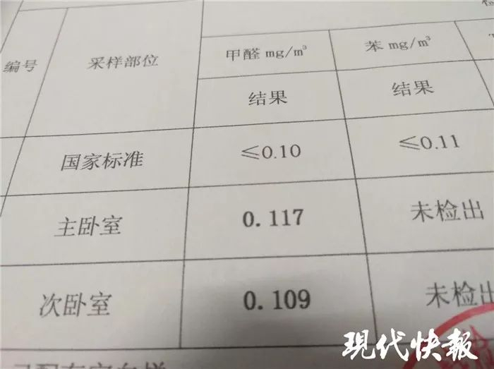 记者了解到,近日,经潘滢慧家属申请,江苏省某专业检测中心对她家的卧室进行检测,结果显示,这个装修了7年多的房子里甲醛超标:潘滢慧居住的房间和其他家人所住房间甲醛含量分别达到0.117mg/m³和0.109mg/m³,而国家标准是小于或等于0.10mg/m³,这意味着所检测的两个房间甲醛含量全部超标。