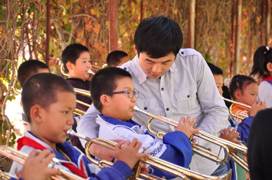 在90团学校,面对记者,校长丌翔对每年来这里的支教成员赞不绝口。学小号的刘志强6年前带领学生训练小号的照片,至今张贴在学校会议室的墙壁上。