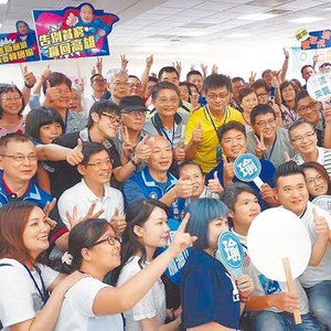 国民党高雄市长参选人韩国瑜(第二排左三)5日成立“韩多路志工团”,与志工朋友自拍合影。(图片来源:台湾《中时电子报》)