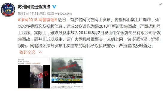 8月3日,“@苏州网警巡查执法”也发文对目前的传言进行辟谣:“有多名网民在网上发布、传播昆山某工厂爆炸死伤众多等图文及视频信息,造成公众误以为是2018年新近发生事故,严重扰乱网上秩序。实际上,爆炸涉及事故为2014年8月2日昆山中荣金属制品有限公司所发生事故。”苏州警方提醒,请广大网民尊重事实,文明上网,勿传谣造谣、混淆视听。网警将对发布不实信息的网民予以执法警示,严重者将及时查处。