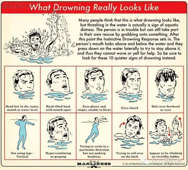 实际上即将溺水的孩子:眼睛睁着,嘴巴半闭,身体垂直,有时候嘴巴在水上,有时候嘴巴在水下,上下漂浮。但最最主要的是,身体都是垂直的。