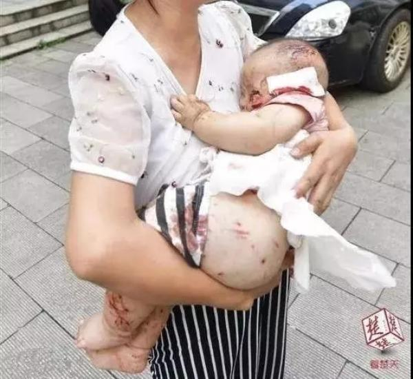 7月10日,奶奶和姑妈带着6个月大的睿睿在小区内广场乘凉时,突然有两条大狗扑来对着睿睿一顿乱咬,其中一条黄狗还从姑妈怀中将睿睿叼走。