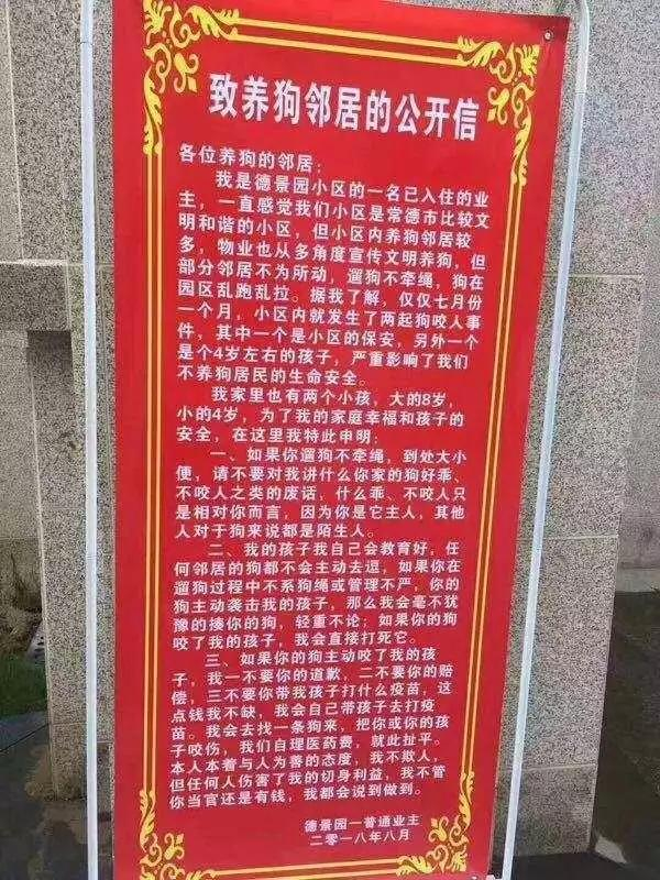 这是一封小区业主致养狗邻居的公开信。虽然措辞很激烈,但有一句话说得好。