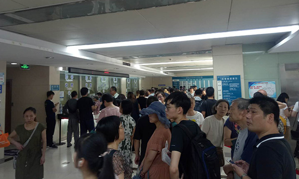 8月7日早晨8点多,同济大学附属口腔医院门诊大厅内已排起长队。澎湃新闻记者 陈斯斯 实习生 陈莉霞 摄