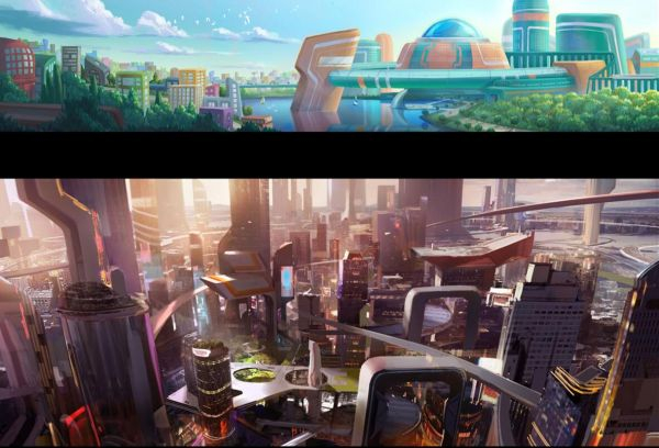 《未来机器城》的第一版的城市设计(上)和最后呈现在影片中的设计(下)。(采访对象供图)
