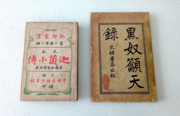 更早期的翻译文学书,也就是晚清的译本,也收藏有几册,比如《迦茵小传》和《黑奴吁天录》,两种都是林纾所译。前者为商务印书馆说部丛书光绪三十一年(1905年)的初版本,一部两册;后者是文明书局也是光绪三十一年版本。林纾翻译的外国文学作品有三部为最有名,此为其二,还有一部是《巴黎茶花女遗事》,这本书的玉情瑶怨馆版木刻本,目前大概售价最高。《迦茵小传》的出版也曾轰动文坛,使中国读者误以为作者哈葛德为英国文学大作家,而其实乃是二流通俗作家。钱钟书认为林的译笔比哈葛德原著高明得多,他宁可读译文也不愿意读原文。《黑奴吁天录》的文明书局版不是最早的版本,最早的版本是武林魏氏光绪二十七年(1901年)出版,木刻线装四册。