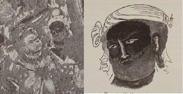这个人物面部整体涂成灰黑色,虽然没有绘出胡须,但面颊与口角刻有皱纹,可以看出是年长的人物。头部的头巾为白色,用赤褐色线条画出布的褶皱,头部侧面有扣子,总之大概是头巾类的物件。笔者想关注的是,这里的头巾与第224 窟中人物的覆盖物所绘的轮廓相同。第224 窟可以看到绿色宽大的帽状物,它涂了厚厚的颜料,看不出布的褶皱,但还是能理解为戴着turban 状的头巾。瓦尔特施密特在报告书的解说中将第114 窟的这类人物称为“贵族”,并把左侧的人物视为这类侍从8。然而,详细观察这个例子,便会注意到这个戴头巾的人物毋宁说被描绘为国王的侍从。(图7 )是第八窟的壁画,这部分被切去现已不存,只留下模糊的照片9。可以确定戴巾蓄须的人物站在国王旁边,是撑伞的姿态。(图8) 是德国队报告书中记载的图像。皮肤黝黑、蓄有浓密黑髯,接近第224 窟的人物。(图9) 在第161 窟的说法图《Muktikā 王女的前世》中登场, 由于图像剥落难以分辨,但可以确认白色的头巾和浓密的胡须,且同样撑着伞。因此,留胡须、戴头巾的人物明显可以视作侍从中的一员,也有多处描绘成为国王撑伞的人。另外,这个人物皮肤色彩一般是灰黑、赤褐、黑等深色,总之意指黑色人种。可以认为他是异族之类的特殊种族。或许还是奴隶身份。