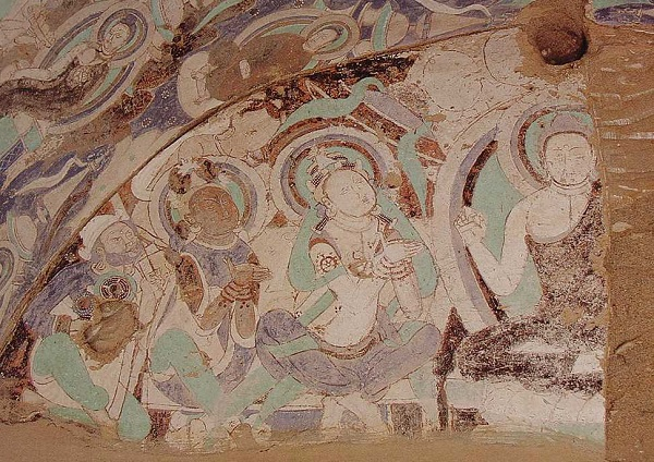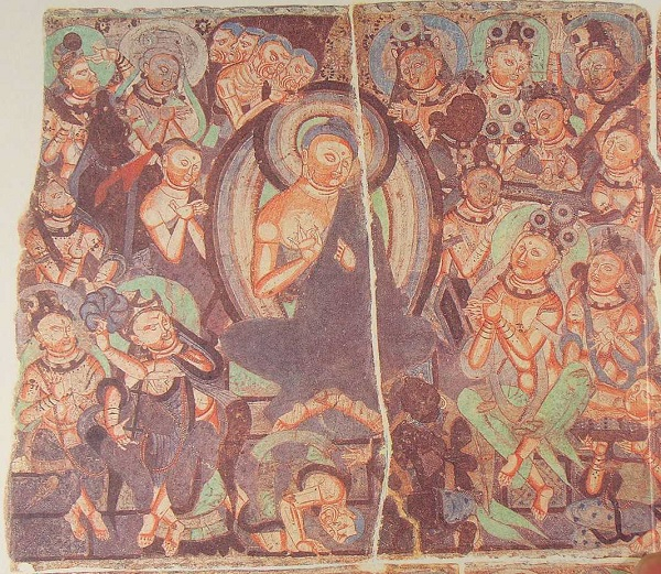 吉美美术馆的收藏中有(图1)的壁画断片。这是个纵横30厘米的断片,整体呈斜四边形,包含五个人。多用青绿,色彩鲜艳,人物配置规整,整体印象华美。遗憾的是剥落明显,当是壁画切下取走之前的破损,似是觊觎宝冠与胸饰等金彩时的人为举动。因此,破坏并不是全面性的,人像的面貌和姿态等能够充分确认。首先准备以人像的描写为中心,观察其内容。人物配置分为上下两段,上段并列两人,下段并列三人。上段的两人都是光头天仙,从头饰及服饰来看,可知对面的左侧为女仙,右侧为男仙。下段左起,首先是皮肤白皙、贵族风格的年轻人,胸前有大块剥落,左胸边缘可见手指,当可窥知本来此处持有某物。从手边到喉咙处呈圆弧状,残留着部分绿色,可认为是所持物品的一部分。第二个是手捧供物的黑须人,绿色覆盖物很显眼,加上浓髯、额头上所绘的皱纹,可见是年长的人物。第三人只在画面右下角残存着头部,肤色暗灰,眉头紧皱,画中是幅凶相,可以确认他戴着硕大的耳环。头发破损难辨,暗褐色的发髻中并列着青白相间的小圆突起物。前述带须的人物,都可说风貌古怪独特。画面左端的年轻贵族头后不远,可以看到其他人物肘与胸的一部分,可知此处本来另有一人。另一方面,壁画断片上部可见青色带状线条。这是画面界线的一部分,显示出断片位于画面上端。另外,从前述带须人物所捧供物的方向来看,断片对面左侧绘有佛陀。