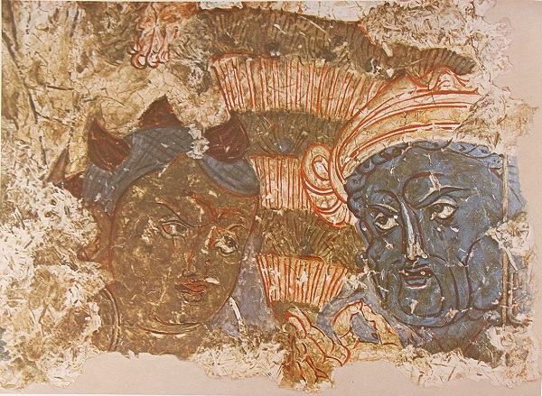 壁画的全像与画的主题已经很明显,接下来想重新讨论吉美美术馆的断片。这个断片包含五个人物,其中尤其引人注目的是手持供物的带须人与头部有突起物的人。听众大多被描绘为贵族姿态,其中这两个人可说是非常独特的存在。