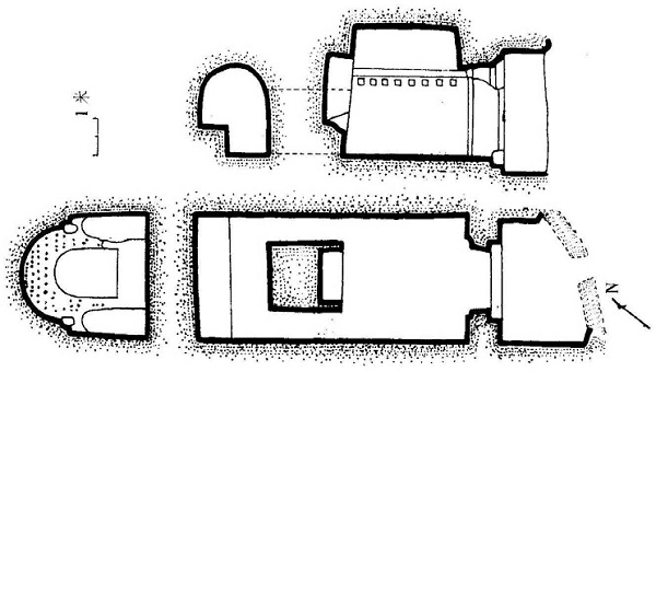 第224 窟在克孜尔石窟中也具有代表性。德国队的报告书也花了较多的篇幅加以解说。石窟位于所谓“后山区”的最深处,即德国队称的第三区,在佛像礼拜窟中也是非常大型的石窟。石窟的形式是以甬道连接前室和主室,主室正壁中央设有佛龛安置本尊,从正壁左右两侧开始围绕本尊背后设有隧道式的回廊(图2)。这种形式从克孜尔石窟到库车地区的石窟都很多见,总之似乎是西域石窟的主流形式。窟内各部分的壁画主题也几乎是诸窟共通的,配置为:主室侧壁是取材于佛传的说法图,天井是本生图或因缘图,后廊是涅槃图或分舍利图。壁画的样式也与先前的断片共通,是克孜尔最盛期的产物,以多用青绿的鲜艳色彩和规整的构图为特征。德国队从这个石窟切取了非常多的壁画,因此目前石窟壁上仍有较大的缺损。失去壁画的空白部分,至今仍清晰地保留着切取时的刀痕。这些刀痕也就呈现出所切取断片的形状。