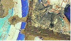 仔细观察窟内的刀痕,可以发现主室右壁的一个残留正与先前吉美美术馆的壁画断片形状大体相同。右壁整体分为上下两段、左右四列,描绘出八幅佛说法图,相应部分是主室右壁上段、入口数第三幅说法图。用电脑将两者实际拼合起来就是图3。断片左侧上下角似有少许破损,但可以认为整体的形状与刀痕非常一致。窟内不允许测量,因此得不出准确的数值,但两者的尺寸几乎相同,描绘的人像大小也一致,另外上端的画框等位置也非常相符。画面内的位置如先前的推定所说,正处在说法图的右上部。更进一步,几乎决定性的是两者表面的伤痕也连成一体。(图3 )接近中央,佛的光环右端有类似棍棒的划痕,仔细查看划痕,它延伸到右上端人像的右颚部分, 即至拼合而成的壁画断片的左下部分为止连成一线(图4)。划痕如此吻合,如果二者原来不是一体的壁面就不可能出现,可以说这是断片本来就在这部分的确凿证据。