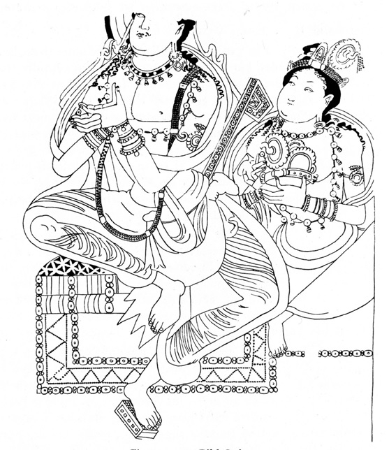 做出同样描绘的例子可见于第188 窟(图14)。右半边大片被切去,因此主题不明,但坐在床座上的夫妇头顶有童子撑开的伞,可以说这也是国王礼佛图的一种。夫妇背后有戴着头巾的蓄须侍从,能够确认其右手持冠、左手持剑。国王以璎珞束起的发髻前戴有三角形的朴素头巾, 果然未戴宝冠。也即是说,这里的国王也是脱冠命侍从秉持。此处不单是冠,连佩剑都让侍从秉持,恐怕是因为国王即将礼佛,暂时把冠、剑除下,命侍从手持。