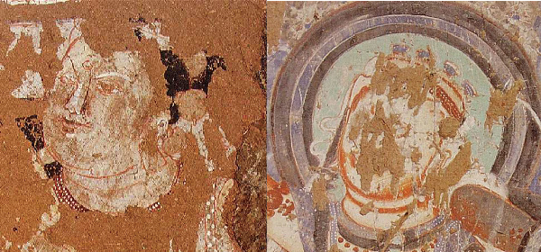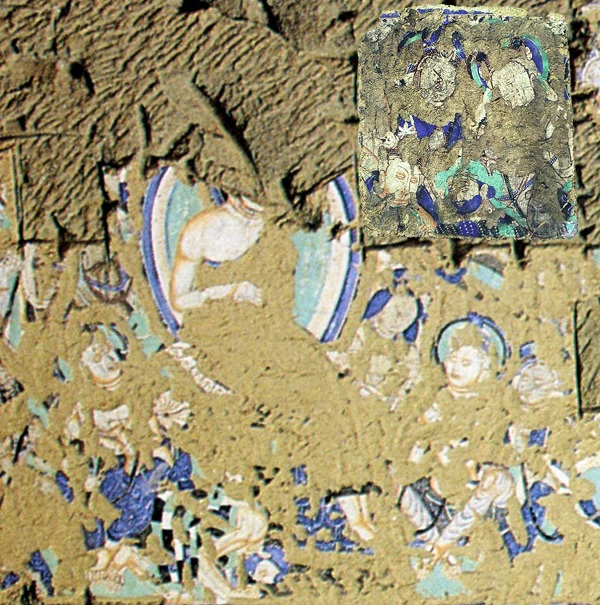 以上是对壁画断片内容的观察。可以看出,这个断片是从佛说法图上取下了供养天人以及听众的一部分,由此推测它本来位于壁画画面右半部分的上端。人物像下段的听众饶有趣味,具有独特风貌的两个人物尤其引人关注。这个壁画断片,本来是哪个壁画的一部分?接下来就想讨论壁画断片具体的原位置。